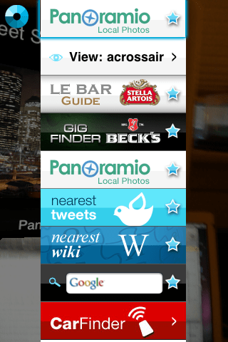 First screen aggregates various information sources such as Panoramio, Stella Artois – LE BAR Guide as well as Acrossair previous apps such as Nearest Tube, etc. Scroll through the long list by swiping your finger iPhone style.