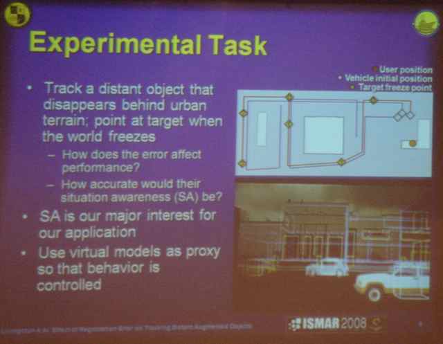Next on stage is Cindy Robertson from Georgia Tech (Honorable mention in ISMAR 2007) and she discusses An Evaluation of Graphical Context in Registered AR, Non-Registered AR, and Heads-Up Displays.